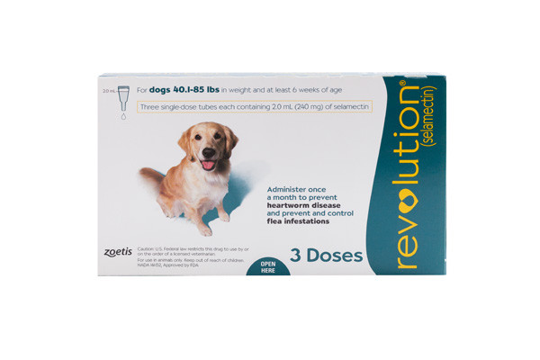 What is Revolution® (Selamectin)? Revolution® (Selamectin) is a safe and simple monthly topical medication used to protect your dog or cat from heartworms, fleas, and ear mites. Revolution® (Selamectin) is also used on dogs for the treatment or prevention of fleas, the American Dog Tick, ear mites, and canine sarcoptic mange. When used on cats it is also used to treat or prevent fleas, ear mites, hookworms, and roundworms. Revolution® (Selamectin) requires a prescription from your veterinarian. (3 Pack = 3 doses which lasts 3 months.) For: Dogs (6 weeks of age or older and no weight requirement), Cats (8 weeks of age or older and no weight requirement) Benefits: Protects your pet from heartworms and fleas Fights both internal and surface parasitic infections Treats Sarcoptic mange in dogs Treats and controls ear mites Controls American Dog Tick infestation Treats and controls roundworms and hookworms in cats Only administered once a month Safe and easy to use How does Revolution® (Selamectin) work? Revolution® (Selamectin) works by penetrating the skin and entering your pet's bloodstream. Concentrations of selamectin, the active ingredient, in the tissue and bloodstream prevent heartworm disease. Selamectin also redistributes into the skin from the bloodstream and kills adult fleas, American dog ticks, and ear mites, and prevents flea eggs from hatching. It is also an anthelmintic, which means it fights to expel parasitic worms. Parasites ingest the drug when they feed on the animal's blood. Revolution® (Selamectin) is safe for pregnant and lactating pets. Cautions: Side effects are uncommon, with less than 1% of dogs showing signs of digestive upsets. It is not advisable to use Revolution® (Selamectin) in pets that are ill or underweight. Collies and herding dog breeds may have a reaction to the ingredient selamectin if given over the recommended dosage amount. If your dog is a collie or other herding dog breed and your veterinarian has prescribed Revolution® (Selamectin), we urge you to monitor your pet for 8 hours and call your vet if your dog displays any signs of weakness, staggering, dilated pupils, trembling, drooling, or pressing his or her head against a wall. Brand Name: Revolution® (Selamectin) (Zoetis) Generic Name: Selamectin (see-la-mek-tin) What is the most important information I should know about Revolution® (Selamectin)? Revolution® (Selamectin) is a prescription medication applied topically once a month. Do not use Revolution® (Selamectin) on puppies under 6 weeks of age or kittens under 8 weeks of age. According to the product literature, Revolution® (Selamectin) is safe for use on pregnant or lactating dogs and cats. What should I discuss with my veterinarian before applying Revolution® (Selamectin) on my pet? Tell your veterinarian if your pet has ever had an allergic reaction to the medication. How should Revolution® (Selamectin) medication be used? Apply Revolution® (Selamectin) exactly as directed by your veterinarian. If you do not understand the directions ask your pharmacist or veterinarian to explain them to you. Revolution® (Selamectin) is available as unit of use applicator tubes containing the specific amount of medication based on the weight of your pet. Revolution® (Selamectin) is available as a 15mg/0.25ml puppy/kitten dose for puppies older than 6 weeks and kittens older than 8 weeks weighing up to 5 lbs. Revolution® (Selamectin) is also available for cats 5.1-15 lbs (45mg/0.75ml), 15.1-22 lbs (60mg/1ml), and for dogs 5.1-10 lbs (30mg/0.25ml), dogs 10.1-20 lbs (60mg/0.5ml), 20.1-40 lbs (120mg/1 ml), 40-1-85 lbs (240mg/2 ml) and 85.1-130 lbs (360mg/3ml). For dogs over 130 lbs use the appropriate combination of tubes. The entire contents of the tube should be used. Do not split the contents as the accuracy of the dose and effectiveness of the medication cannot be assured. Bathing or shampooing your pet 2 or more hours after treatment will not reduce the effectiveness of Revolution® (Selamectin). Keep this medication away from children and pets. What happens if I miss applying a dose of Revolution® (Selamectin)? Give the missed dose as soon as you remember. Do not give a double dose of the medication. What happens if I overdose my pet on Revolution® (Selamectin)? Seek emergency veterinary medical treatment. Symptoms of overdose, while rare, may include salivation and lack of coordination, as well as symptoms listed below as side effects. What should I avoid while using Revolution® (Selamectin) on my pet? Because humans can contract hookworms from animals, it is important to maintain good personal hygiene. It is also important to eliminate fleas on your pet and in the household and to not feed your pet rodents or uncooked meat or fish. To prevent reinfection, daily cleanup of stools is recommended. Do not use on sick, weak, or underweight animals. Do not apply to wet hair. Dogs should be tested for heartworms prior to using Revolution® (Selamectin). In humans, Revolution® (Selamectin) may be irritating to skin and eyes. Wash hands thoroughly after applying Revolution® (Selamectin) to your pet. What are the possible side effects of Revolution® (Selamectin)? Side effects of Revolution® (Selamectin) that may occur include temporary hair loss at the site of application, loss of appetite, drooling, vomiting, diarrhea, drowsiness, rapid breathing, increased heart rate, and muscle tremors. What other drugs will affect Revolution® (Selamectin)? Do not apply Revolution® (Selamectin) to your pet if already giving an alternate heartworm medication. When switching from another heartworm medication, begin Revolution® (Selamectin) when the next dose of the heartworm medication is due.