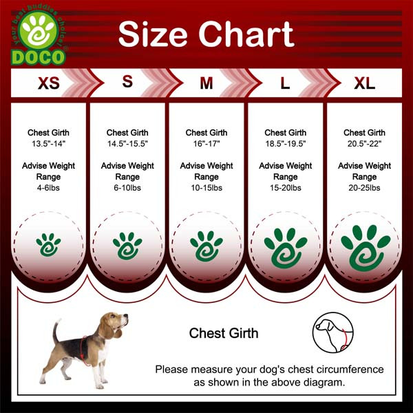 DOCO® Athletica QUICK FIT Mesh Harness, fray resistant 3mm thick high dense air mesh that provides ultra comfort on buddy’s neck and chest area. Less pressure around neck than classic collars for easier training and outdoor activities. Reflective piping throughout the entire vest harness for additional safety in darkness when walking the dog. Plastic buckle on the top that quickly clicks shut and stays put and ensure extra security. Designed with adjustable Velcro size adjustment strap for fast adjustment and customs fits for different girth sizes. Cross-stitched nylon straps for optimal tension distribution and protection against neck injuries. Heavy-duty stitching for lasting quality and two metal D-Rings for secure lead. Solid and vibrant colors are easy to see. Make sure to select the matching DOCO® breathable air mesh leashes to complete your buddies look! * Match with DOCO® Mesh Leash:DCA1048, DCA1348, DCA1150 All of DOCO® harnesses are designed to reduce stress, allowing weight to be distributed evenly through the chest and shoulders when your buddy pulls walking. Special features 100% high quality dense 3mm thick air mesh Reflective piping for the additional safety in darkness Cross-stitched nylon straps for optimal tension distribution Provides efficient air flow throughout the chest area Form fitted and adjustable in the back Heavy duty stitching for long lasting quality Less pressure on the chest and neck Heavy duty two D-Rings for leash and id tag Durable plastic buckle for easy on and easy off Velcro for easy size adjustment Vibrant colors are easy to see at any times! Size Chart XS Girth 12.5-14" S Girth 14-16" M Girth 16-18" L Girth 18-21" XL Girth 21-23"