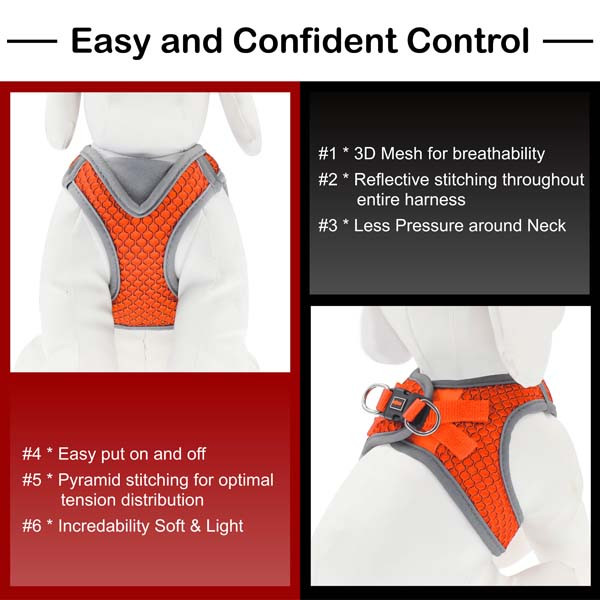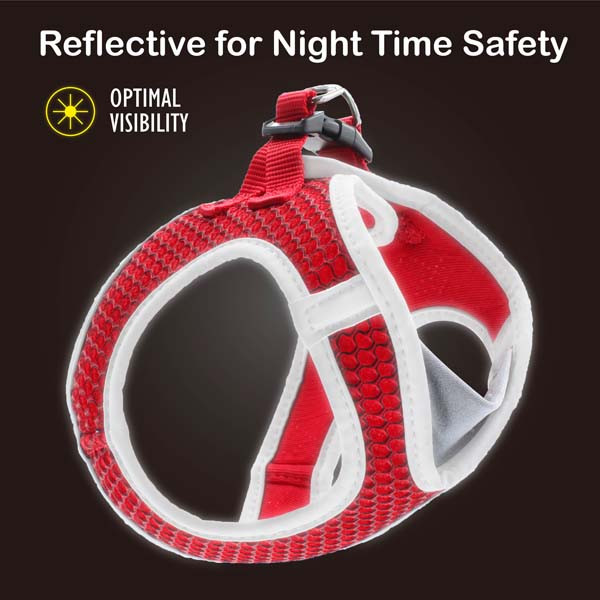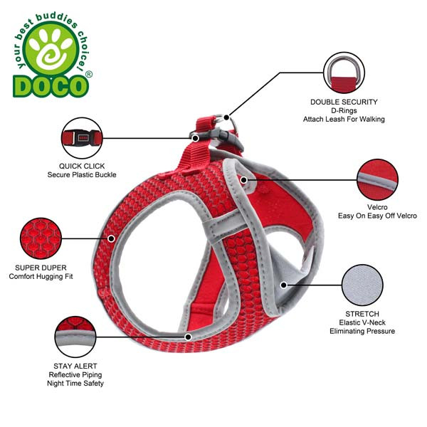 DOCO® Athletica QUICK FIT V Mesh Harness fray resistant 3mm thick high dense air mesh that provides ultra comfort on buddy’s neck and chest area. Less pressure around neck than classic collars for easier training and outdoor activities. Reflective piping throughout the entire vest harness for additional safety in darkness when walking the dog. Plastic buckle on the top that quickly clicks shut and stays put and ensure extra security. Designed with adjustable Velcro size adjustment strap for fast adjustment and customs fits for different girth sizes. Cross-stitched nylon straps for optimal tension distribution and protection against neck injuries. Specially designed V-Neck patch with elastic fabric eliminates pressure around neck. Heavy-duty stitching for lasting quality and two metal D-Rings for secure lead. Solid and vibrant colors are easy to see. Make sure to select the matching DOCO® breathable air mesh leashes to complete your buddies look! * Match with DOCO® Mesh Leash:DCA1048, DCA1348, DCA1150 All of DOCO® harnesses are designed to reduce stress, allowing weight to be distributed evenly through the chest and shoulders when your buddy pulls walking. Special features 100% high quality dense 3mm thick air mesh with honey comb pattern Reflective piping for the additional safety in darkness Cross-stitched nylon straps for optimal tension distribution Provides efficient air flow throughout the chest area Form fitted and adjustable in the back Heavy duty stitching for long lasting quality Less pressure on the chest and neck Heavy duty two D-Rings for leash and id tag Durable plastic buckle for easy on and easy off Velcro for easy size adjustment Vibrant colors are easy to see at any times!