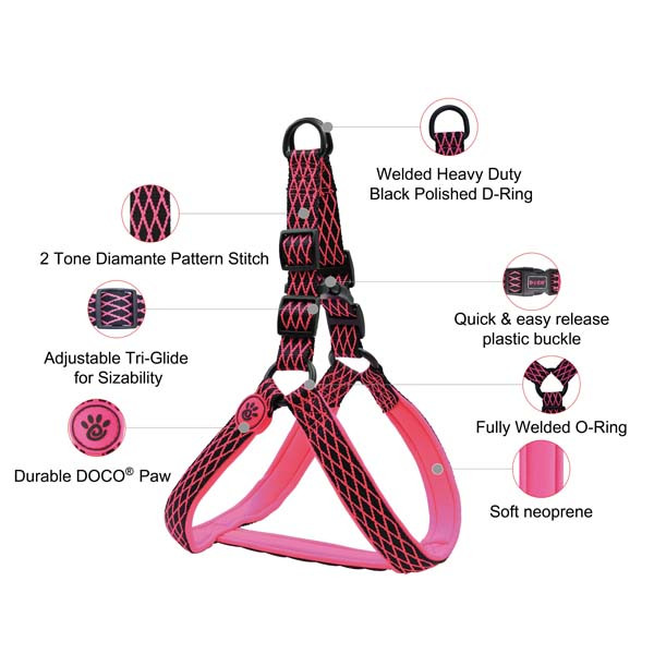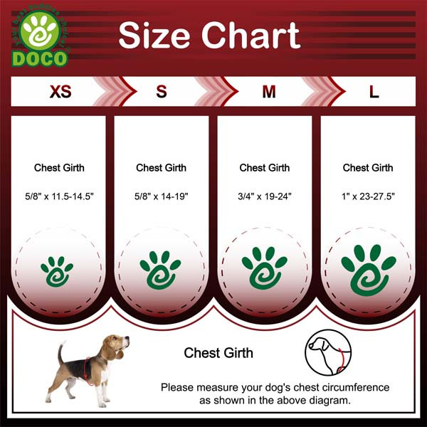 DOCO® Dual Layer Air Mesh Reflective Step-in Harness features breathable and durable high quality air mesh. This harness provides a comfort fit, total control and style between your chest. Ultra comfort, lightweight design and dual layered for higher tensile strength. Easy on and easy off, durable side release plastic buckle with adjustable tri-glide for custom fits. Heavy-duty stitching for lasting quality and fully welded metal D/O-Rings for higher tensile force. Solid and vibrant colors are easy to see. Piping has reflective stitching to ensure your buddy is safe and seen at all times. Make sure to select the matching DOCO® leashes to complete your buddies look! Air Mesh is breathable and light weight, keep your pet cool and ventilated and super soft and comfortable on Dog's skin and fur. All of DOCO® harnesses are designed to reduce stress, allowing weight to be distributed evenly through the chest and shoulders when your buddy during walks. * Match with DOCO® Mesh Leash: DCA1348 Special features Hi-Density quality air mesh fabric Breathable and SUPER LIGHT WEIGHT Dual Layered mesh for higher tensile strength Reflective piping thread stitch throughout the collar for the nighttime safety Heavy duty D-Ring for leash and ID tag Durable plastic buckle on the top for easy on and easy off Tri-glide for easy size adjustment Vibrant colors are easy to see at all times! Size Chart S 5/8x11-16" M 5/8x15-20" L 3/4x19-24" XL 1x23-27.5"