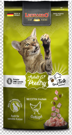 For adult cats from one year of age. No gluten or cereals are used in LEONARDO® Adult Poultry GF. Cereals have been replaced in this recipe by nutrient-rich amaranth. LEONARDO® Adult Poultry GF is the perfect solution for cats with food intolerances and cats that tend to suffer from allergies. COMPOSITION Fresh poultry meat (30 %); Poultry protein, low ash, dried (22 %); Amaranth (15 %); Potato starch; Pea flour; Poultry fat; Poultry liver, hydrolysed; Marine zooplankton, ground (Krill, 2.5 %); Fish meal from sea fish (2.5 %); Brewers’ yeast, dried (2.5 %); Egg, dried; Grape pips expeller; Chia seeds (1.3 %); Carob pods, dried; Sodium chloride; Potassium chloride; Dicalcium phosphate; Chicory inulin ANALYTICAL CONSTITUENTS Protein 32 %; Fat content 18 %; Crude ash 8.2 %; Crude fibre 2.8 %; Moisture 10 %; Calcium 1.0 %; Phosphorus 0.7 %; Sodium 0.4 %; Magnesium 0.09