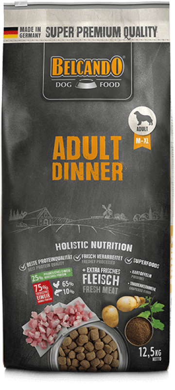 From 1 year of age Large croquettes Protein 23% - Fat 10.5% Holistic dry food Normal activity levels, Careful selection of raw ingredients, plenty of tender poultry, healthy potatoes and cold-pressed grape seed flour give BELCANDO ADULT DINNER the ideal combination of nutrients for adult dogs. The limited content of protein and fat is adapted to the requirements of dogs with normal activity levels.If the right quantity is fed, the dog's body weight will remain constant and the satiety level will be appropriate.The larger croquettes encourage the dog to chew