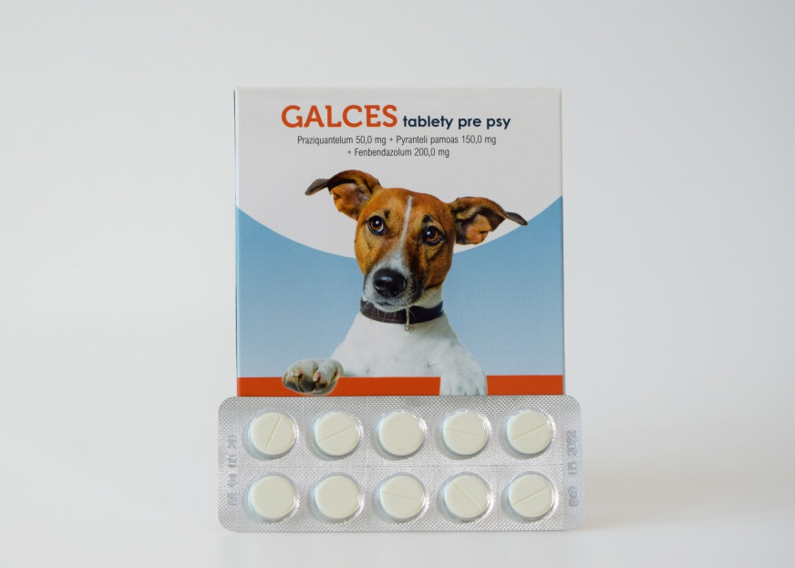 Galces plus for dogs & cats 1 scored tablet contains: Praziquantel 50 mg Pyrantel pamoate 150 mg Fenbendazole 200 mg Dose: Cats : Up to 2 kg bodyweight ¼ tablet 2-5 kg bodyweight ½ tablet Dogs : 1 tablet for 10 kg bodyweight Made in Slovak Republic