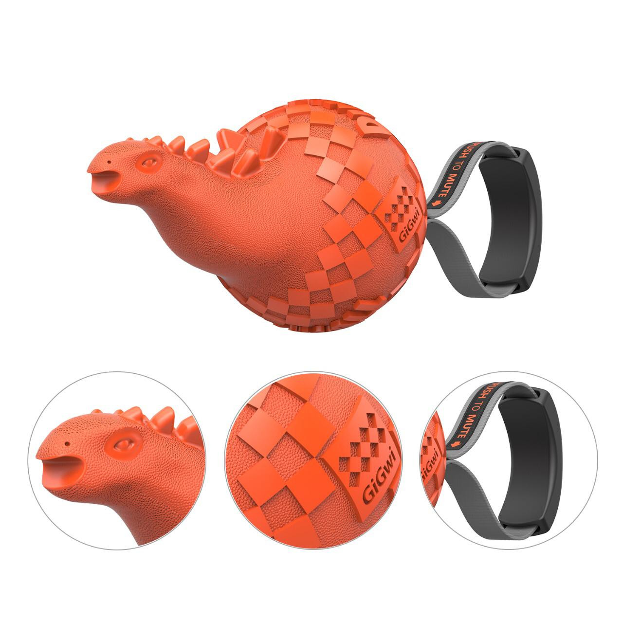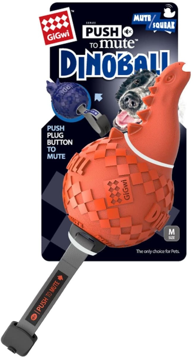 Designed for medium and large sized dogs Durable, colorful dinosaur design Can turn off squeaking when desired The Gigwi Dinoball Push To Mute green T-Rex is a colorful squeaky toy designed for energetic dogs who love to chew and chew some more. Made of durable material, this toy is perfect for medium and large sized dogs with strong jaws. As much as dog owners love seeing their pooches happy and satisfied, sometimes the sound of a squeaky toy can become a bit annoying after a few hours of constant chewing which is why the Gigwi Push To Mute T-Rex has the ability to switch off the squeaking ability. By firmly pushing the plastic notch at the bottom towards the inside of the toy, you can enjoy hours of squeak free enjoyment without having to stop your dog from playing.