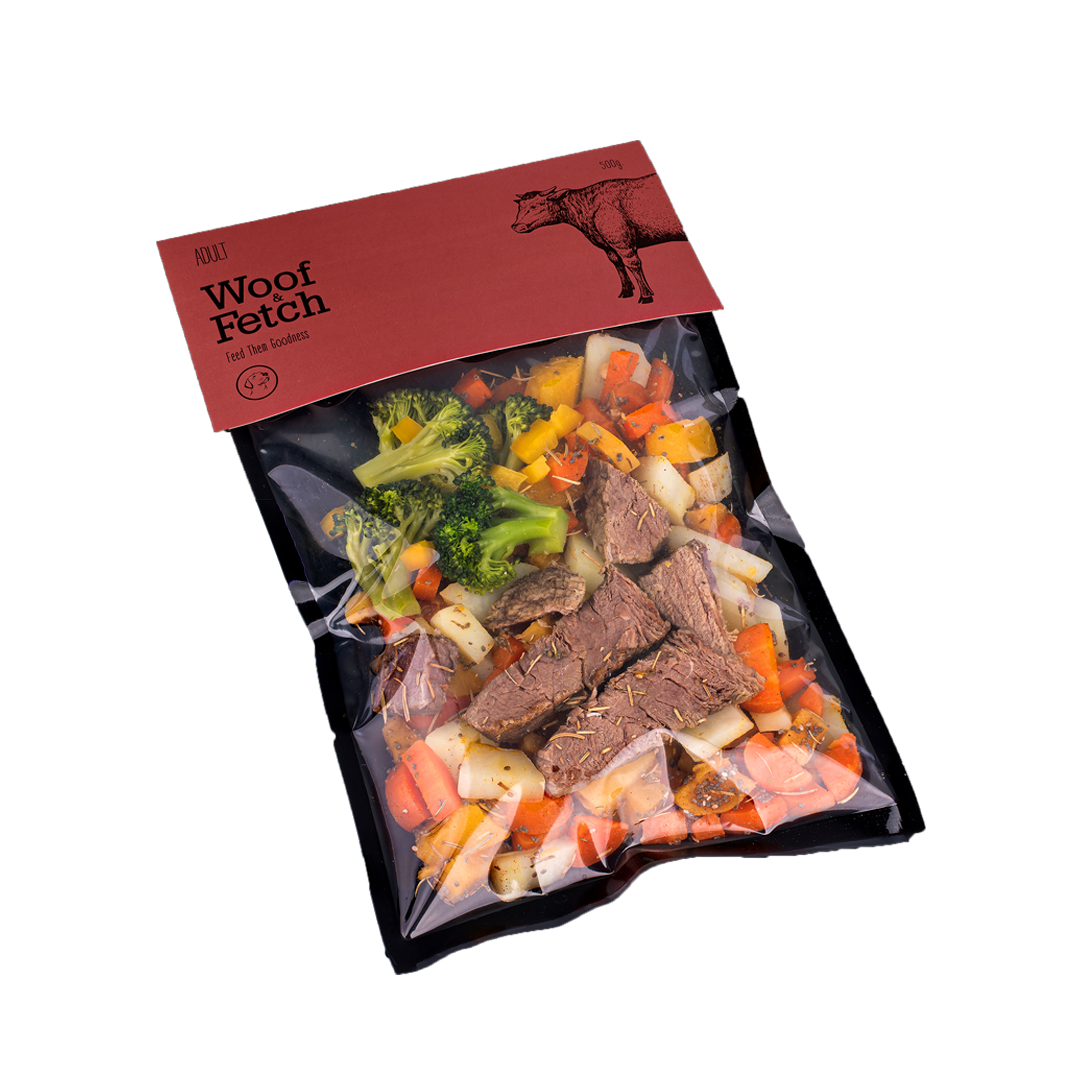 Fresh & wholesome dog food containing locally sourced vegetables and lean meat, perfectly delicious for your dog. Infused with touches of rosemary, turmeric, omega-3, and flax seeds for your dog's health & benefits. Maximum freshness is guaranteed with its vacuum sealed packaging. Packs information: -All our packs are 500gm. -Woof & Fetch meals are vacuum sealed, Injected with Nitrogen and CO2 in order to maintain freshness & for preservation. They stay in the fridge closed for 6 weeks. Frozen for 8 months. Packs should be consumed within 2 days once opened and it can be microwaved only with the bag open. -Each pack is a fully nutritious meal with no need to add anything else to it. -At Woof & Fech, We do not offer minced meals - as we encourage chewing (for jaw muscles and gum health) and because chewing encourages digestion and a healthier bowel movement.