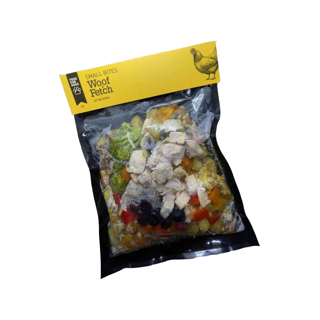 Fresh & wholesome dog food containing locally sourced vegetables and chicken, perfectly delicious for your dog. Infused with touches of rosemary, turmeric, omega-3, and flax seeds for your dog's health & benefits. Maximum freshness is guaranteed with its vacuum sealed packaging. Packs information: -All our packs are 500gm. -Woof & Fetch meals are vacuum sealed, Injected with Nitrogen and CO2 in order to maintain freshness & for preservation. They stay in the fridge closed for 6 weeks. Frozen for 8 months. Packs should be consumed within 2 days once opened and it can be microwaved only with the bag open. -Each pack is a fully nutritious meal with no need to add anything else to it. -At Woof & Fech, We do not offer minced meals - as we encourage chewing (for jaw muscles and gum health) and because chewing encourages digestion and a healthier bowel movement.