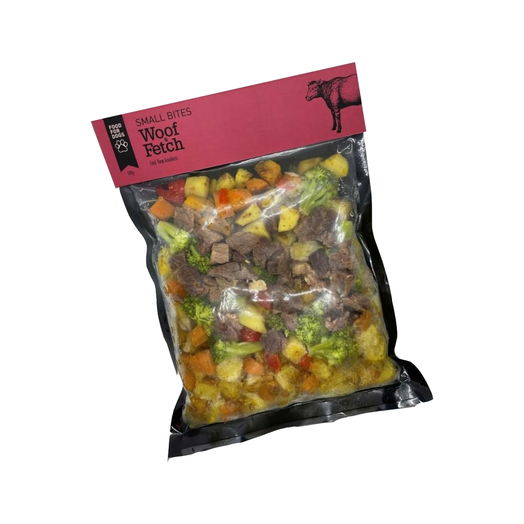 Fresh & wholesome dog food containing locally sourced vegetables and lean meat, perfectly delicious for your dog. Infused with touches of rosemary, turmeric, omega-3, and flax seeds for your dog's health & benefits. Maximum freshness is guaranteed with its vacuum sealed packaging. Packs information: -All our packs are 500gm. -Woof & Fetch meals are vacuum sealed, Injected with Nitrogen and CO2 in order to maintain freshness & for preservation. They stay in the fridge closed for 6 weeks. Frozen for 8 months. Packs should be consumed within 2 days once opened and it can be microwaved only with the bag open. -Each pack is a fully nutritious meal with no need to add anything else to it. -At Woof & Fech, We do not offer minced meals - as we encourage chewing (for jaw muscles and gum health) and because chewing encourages digestion and a healthier bowel movement.