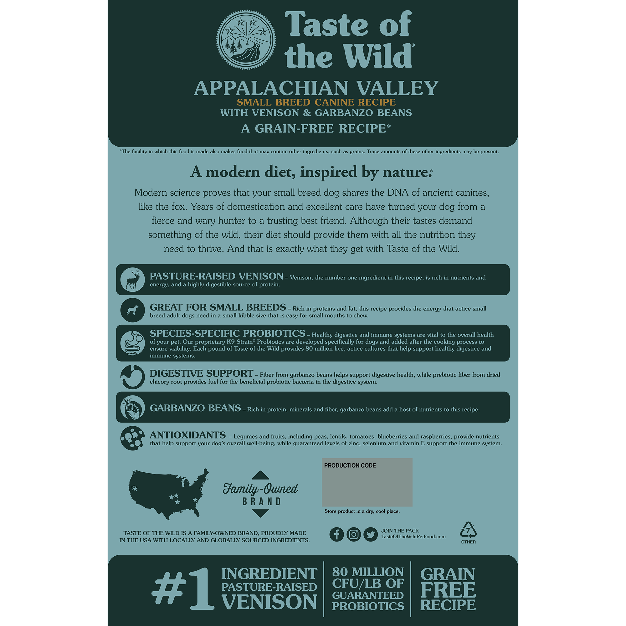Highly digestible venison and small kibble size make this recipe easy on your small breed dog’s tummy and teeth. Probiotics and prebiotic fiber help support healthy digestion, while roasted venison along with lamb, egg, duck and ocean fish proteins provide recommended amino acid nutrition. Rich in protein and fat, this recipe provides the energy that active small dogs need.