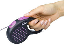 3 m cord leash For little dogs, cats and other small animals up to max. 8 kg Pocket-format Comfortable short-stroke braking system Chromed snap hook Product weight: 100 g approx. Blue