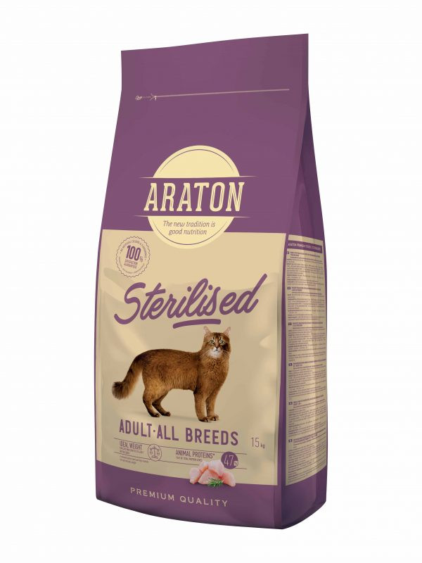 ARATON® Sterilised Adult For All Breeds Suitable for adult neutered cats. It contains a moderate level of fat to limit weight gain and helps maintain optimal urine pH values. Complete and balanced dry food with chicken. For cats after sterilization and/or with tendency to put on weight. Composition: dehydrated poultry meat 24%, maize, triticale, maize gluten, wheat bran, poultry fat, hydrolysed chicken liver, sugar beet pulp. Additives / 1 kg: Food additives: vitamin A(3a672a) – 15000 IU, vitamin D3 (3a671) – 1500 IU, vitamin E (3a700) – 360 mg, iron sulfate (II)(3b103) – 37.5 mg, anhydrous calcium iodide (3b202) – 1.13 mg, copper (II) sulfate pentahydrate (3b405) – 3.75 mg, manganese sulfate monohydrate (3b503) – 15 mg, zinc sulfate monohydrate (3b605) – 67.5 mg, sodium selenite (3b801) – 0.075 mg, taurine (3a370) – 750 mg. Technological additives: antioxidants, preservatives. Analytical ingredients: crude proteins 32%, crude oils and fats 10%, crude ash – 6.5%, crude fibers – 2%, calcium – 0.98%, phosphorus – 0.85%.