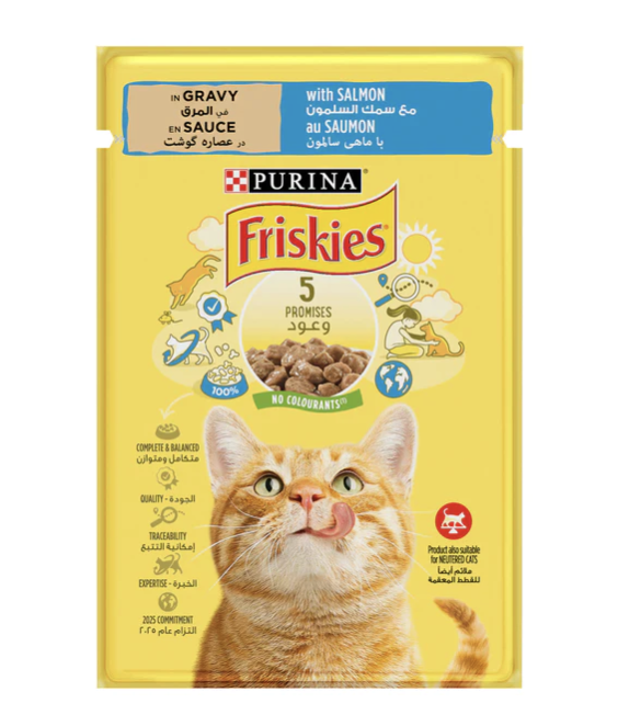 Friskies With Salmon In Gravy is formulated to meet the nutritional levels established by the AAFCO Cat Food Nutrient Profiles for all life stages. ANALYTICAL CONSTITUENTS: Moisture 84%, Protein 6%, Fat content 2.3%, Crude ash 1.6%, Crude fibres 0.1%. COMPOSITION: Meat and animal derivatives, cereals, fish and fish derivatives (of which salmon 4%), minerals, various sugars. ADDITIVES: Nutritional additives: IU/kg: Vit A: 541; Vit D3: 83; mg/kg: Fe (E1): 19; l (E2): 0.24; Cu (E4): 2.14; Mn (E5): 3.7; Zn (E6): 31. For an average adult cat (4kg), feed 4 pouches per day served in 2 meals at room temperature. The adult maintenance averages are based on moderately active cats at normal environmental temperatures. Individual needs vary and feeding should be adjusted as required to maintain your cat at a lean, healthy body weight. Fresh, clean drinking water should always be available.
