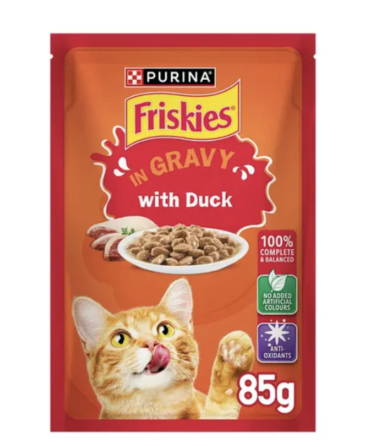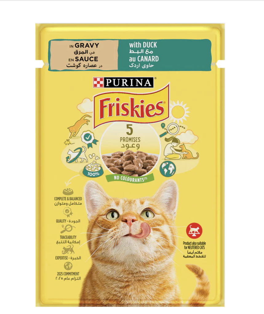 COMPOSITION: Meat and animal derivatives (of which duck 4%), cereals, minerals, various sugars. ADDITIVES: Nutritional additives: IU/kg: Vit A: 541; Vit D3: 83; mg/kg: Fe (E1): 19; l (E2): 0.24; Cu (E4): 2.14; Mn (E5): 3.7; Zn (E6): 31. ANALYTICAL CONSTITUENTS: Moisture 84%, Protein 6%, Fat content 2.3%, Crude ash 1.6%, Crude fibres 0.1%. For an average adult cat (4kg), feed 4 pouches per day served in 2 meals at room temperature. The adult maintenance averages are based on moderately active cats at normal environmental temperatures. Individual needs vary and feeding should be adjusted as required to maintain your cat at a lean, healthy body weight. Fresh, clean drinking water should always be available.