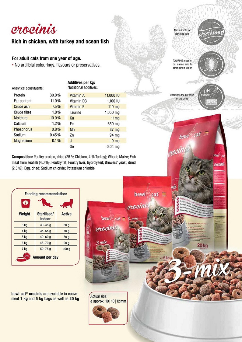 * Bewi Cat Crocinis Complete food for cats * Rich in chicken, with turkey and sea fish - For adult cats over one year old Composition Poultry protein, drid (25% chicken, 4% turkey); Wheat; Corn; Fishmeal from marine fish (4.0%); Poultry fat; Poultry liver, hydrolyzed; Brewer's yeast, dried (2.5%); Egg, dried; Sodium chloride; potassium chloride Analytical components Protein 30%; Fat content 11%; Crude ash 7.5%; Raw fiber 1.8%; Humidity 10%; Calcium 1.2%; Phosphorus 0.8%; Sodium 0.45%; Magnesium 0.1%