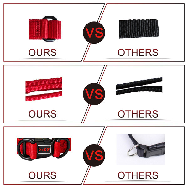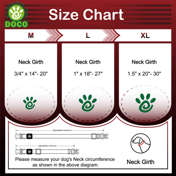 DOCO® Double D-Ring Nylon Collar has two fully welded black color finished D-rings for added security and strength. This 2 D-ring collars design is to alleviate the pressure from the quick release buckle. Allowing this collar to have maximum pull strength. The high quality nylon provides a comfort fit between your dogs neck and collar. ID ring for attaching your pets identification. Feel safe and secure with the collar. Perfect for bigger breed and when you handling a strong dog. Special Features : 100% high quality nylon Higher tensile strength Nylon is resistance to mildew, aging and abrasion Quick & easy release plastic buckle Tri-glide for easy size adjustment Heavy duty D-Ring for leash and ID tag Vibrant colors are easy to see at all times!