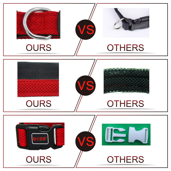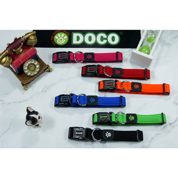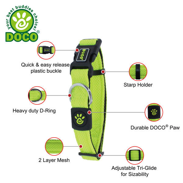 DOCO® Puffy Mesh Collar features lightweight and durable high quality air mesh that provides a comfort fit, total control, style between your dog's collar and neck. Ultra comfort designs using smoother webbing for the comfort of your buddy. Easy on and easy off, durable side release plastic buckle with adjustable tri-glide for custom fits. Heavy-duty stitching for lasting quality and metal D-Ring for attaching identification tag and leash. Air Mesh is breathable and light weight, keep your pet cool and ventilated and super soft and comfortable on Dog's skin and fur. Solid and vibrant colors are easy to see. Make sure to select the matching DOCO® leashes to complete your buddies look! * Match with DOCO® Puff Mesh Leash: DCA1150 Special Features Hi-Density quality air mesh fabric Breathable and SUPER LIGHT WEIGHT Dual Layered mesh for higher tensile strength Solid color mesh front & smooth webbing in the back for comfort for dog's neck Heavy duty D-Ring for leash and ID tag Durable plastic buckle Tri-glide for easy size adjustment Vibrant colors are easy to see at all times!