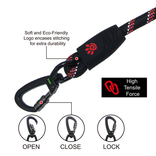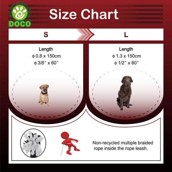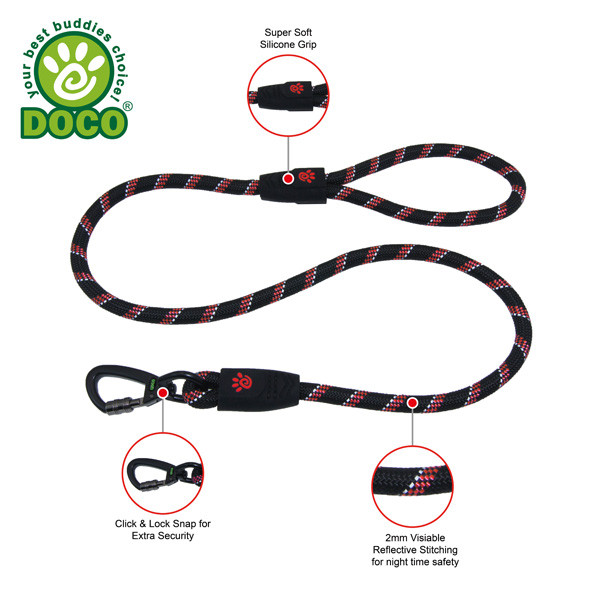 DOCO® 5ft Reflective Rope Leash with Soft Rubber Handle features soft rubber handles for comfort on the hand grip. Designed with our patented rope clip that is outstanding in design. There are reflective stitching throughout the rope that reflects the light for extra safety in darkness. Soft rubber handle gives comfort on the hand when walking the dog. Specially made with thinner diameter rope for mid / small sized buddies. They also deserve cool, strong and nice looking rope leash! * Match with DOCO® Nylon Collars: DCSN002, DCS006 * Match with DOCO® Nylon Harness: DCSN202 Special Features Our four foot dog leads are a popular length, and a good choice for walking most dogs. This leash works well for basic obedience training of puppies, and young dogs. Size