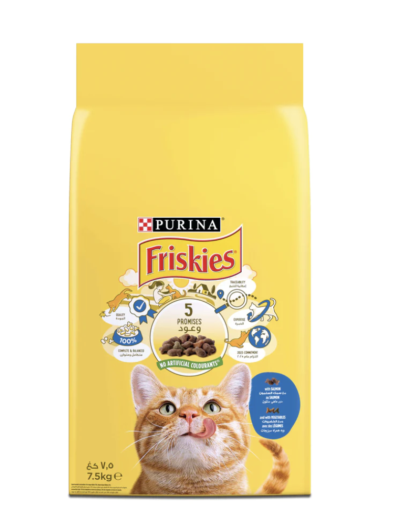 * A 100% complete and balanced nutrition developed with selected quality ingredients to give your cat the meals he likes and needs. * Typical composition of the product: 75% of red and brown croquettes; 25% of green, orange and white croquettes. * Complete food for adult cats. * Tonic muscles * Healthy urinary system * Healthy teeth and bones ** COMPOSITION: Cereals, meat and animal by-products, vegetable protein extracts, oils and fats, by-products of vegetable origin, fish and fish by-products (1.6% **), minerals, yeasts, vegetables (croquettes green, orange and white: 0.5% dehydrated vegetables equivalent to 4% vegetables). * Equivalent to 4% fish and rehydrated fish by-products, red and brown kibble: equivalent to 4% salmon. ** ADDITIVES: NUTRITIONAL ADDITIVES: IU / kg: Vit A: 12,500; Lives D3: 1,000; mg / kg: Ferrous sulphate monohydrate: 145; Anhydrous calcium iodate: 2.4; Cupric sulphate pentahydrate: 35; Manganese sulphate monohydrate: 15; Zinc sulphate monohydrate: 182; Sodium selenite: 0.23; Taurine: 870. Dyes and antioxidants. ** ANALYTICAL CONSTITUENTS: Protein: 30.0% Fat content: 10.0% Crude ash: 7.5% Crude fiber: 2.5% ** RECOMMENDED DAILY RATIONS (g / day): 3kg : 50g 4kg : 70g 5kg : 90g This product can be served alone or in combination with FRISKIES ® 100g freshness packs 4kg : 70g or 50g + 1 sachet freshness of 100g * The recommended daily maintenance rations are calculated for a cat with moderate activity under normal environmental and temperature conditions. Nutritional requirements may vary depending on the cat, so adjust these diets to maintain the weight of the diet. *Water promotes dilution of urine and supports the urinary health of your cat. Be sure to leave a bowl of clean, fresh water at your disposal.