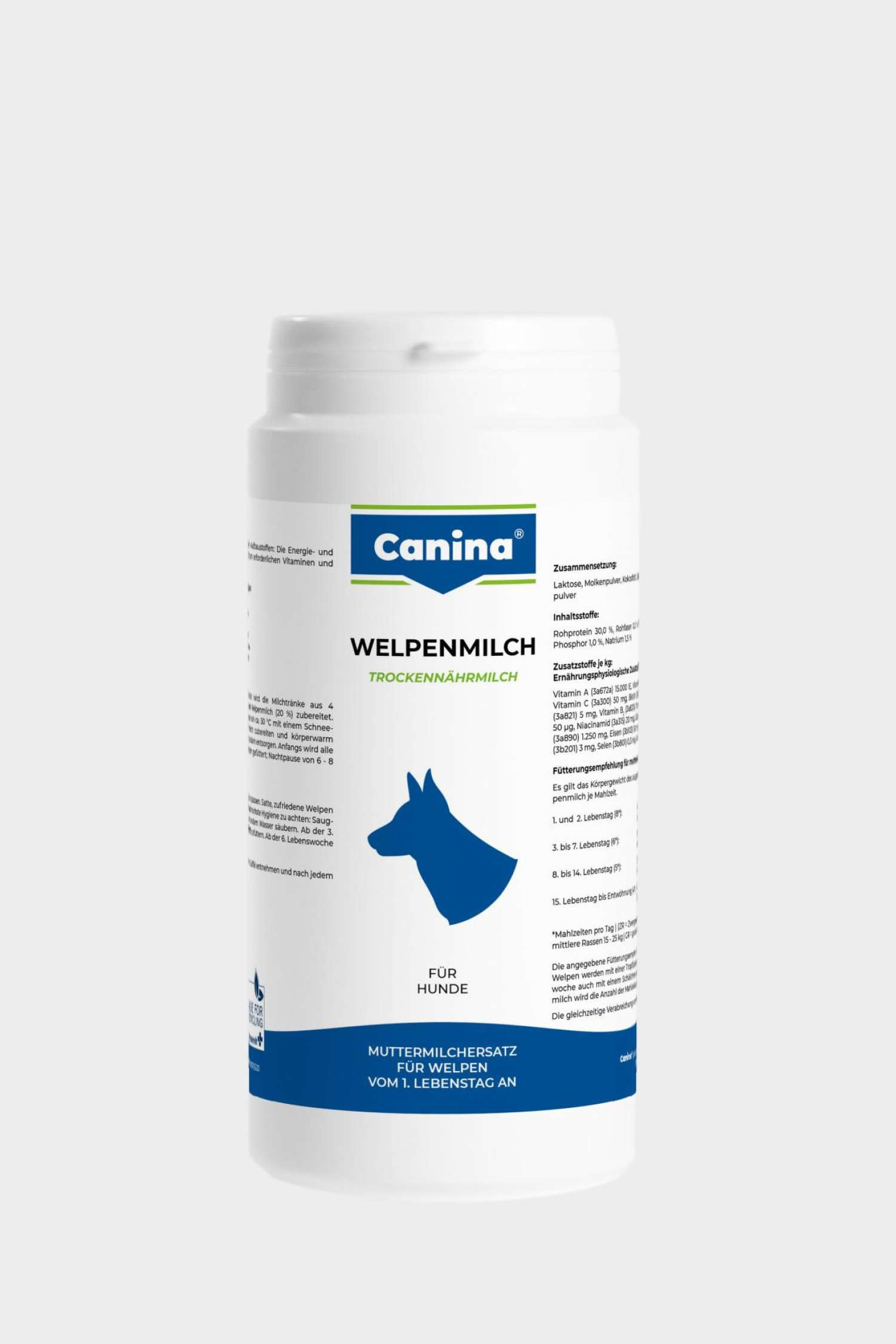 The amount of puppy milk should be adjusted according to the demand of the puppies. Beginning with the 3rd/4th week of life Canina's Mushy Puppy Feed should be administrated additionally, but the Puppy Milk should be administered until the 6th week.