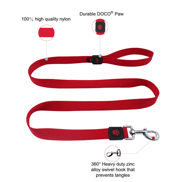 DOCO® Signature Nylon Leash features soft, fray resistant nylon walking, hiking and running. Chrome polished, zinc alloy durable metal 360° swivel hook is comfortable to snap on any dog collar or harness. Optional ID ring for your dogs tags or your keys.